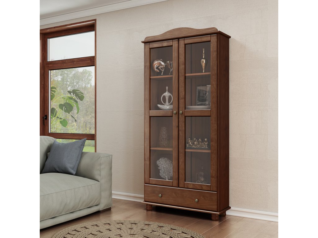 Barevné provedení tmavě hnědá, materiál masiv, 3 police široká zásuvka s kovovými pojezdy, 2 prosklené dveře.Doplňkové parametry