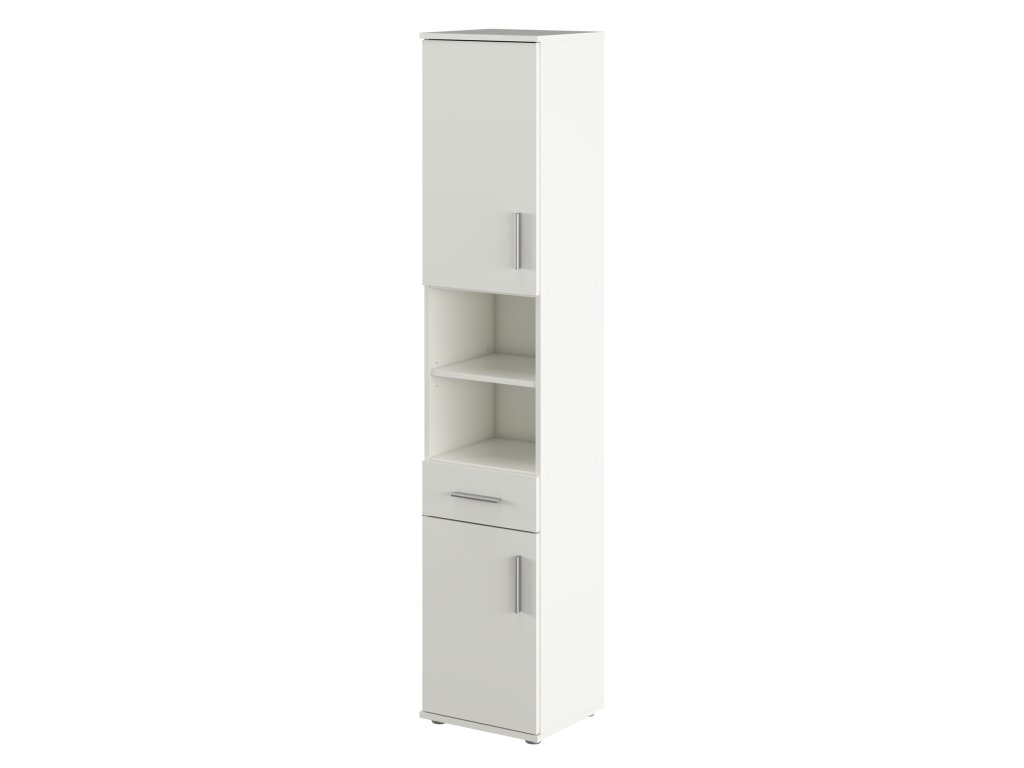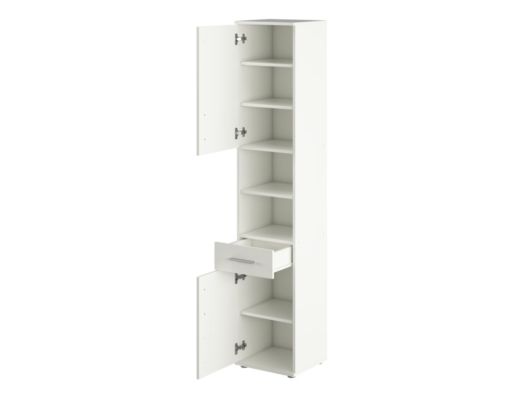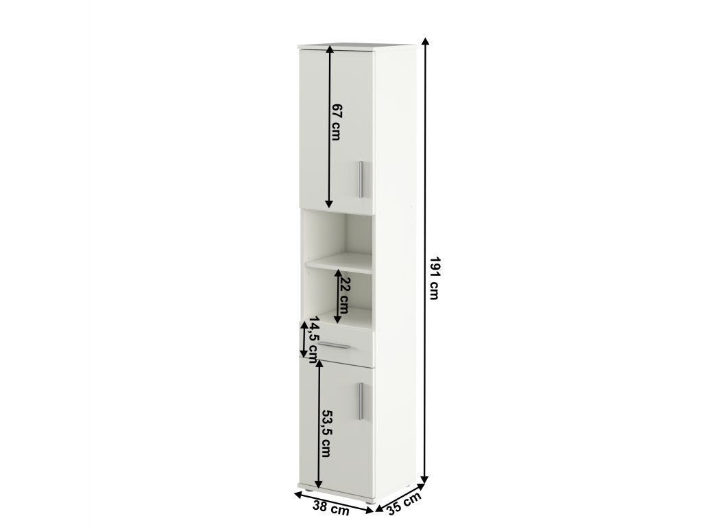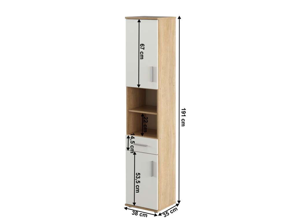 Vysoká skříňka LESSY NEW 05 spojuje moderní design a praktické využití. Nabízí police, šuplík i otevřený prostor, ideální do koupelny či předsíně.● Materiál: DTD laminovaná