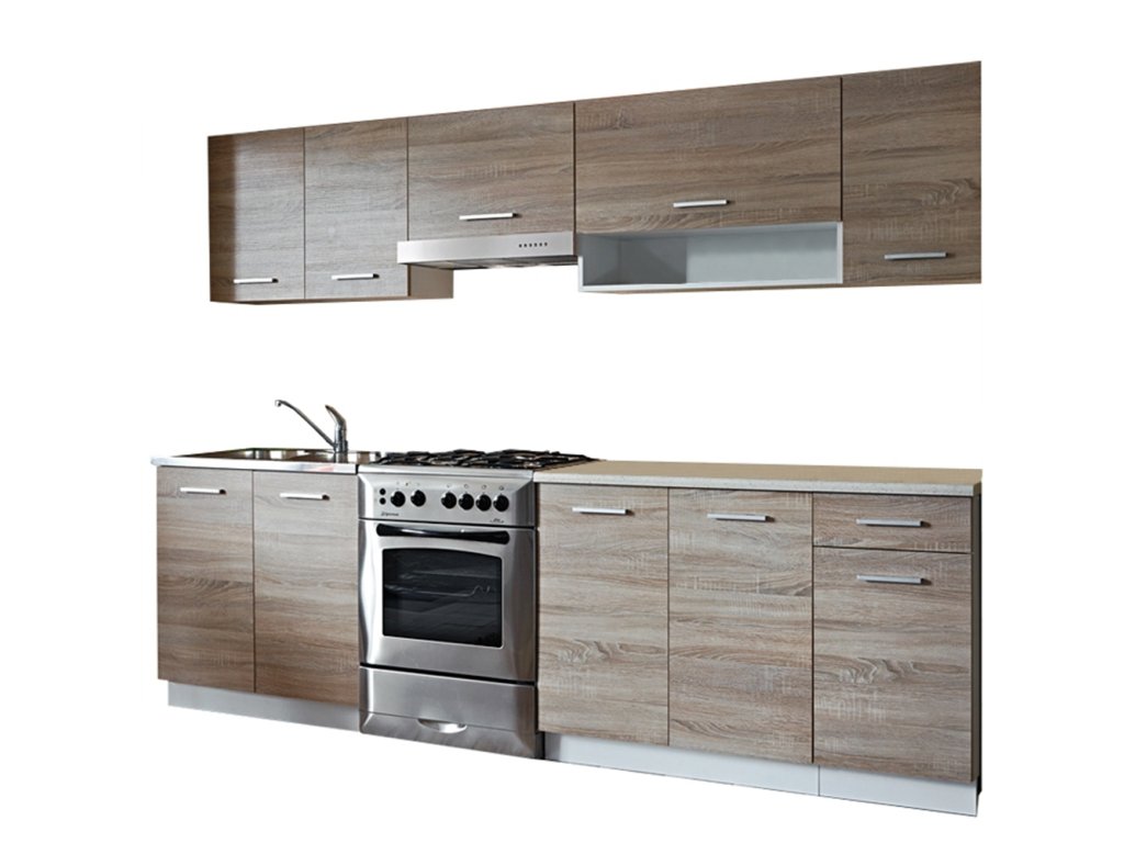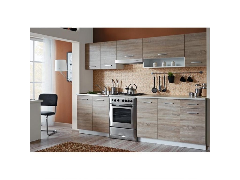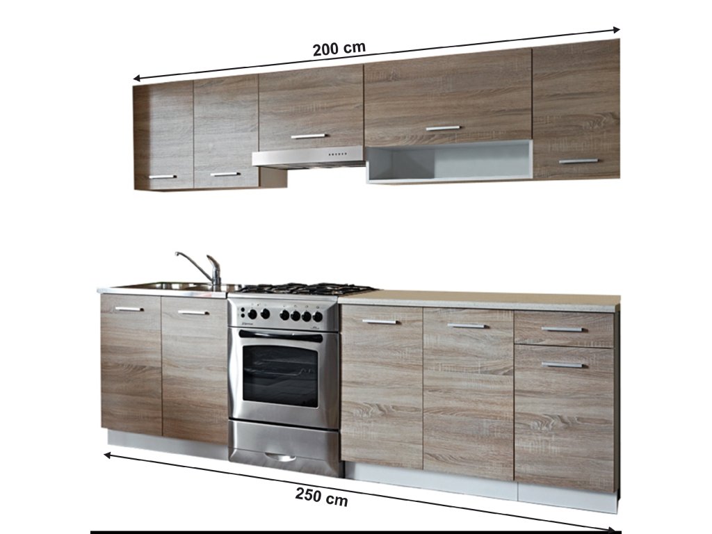 základní kuchyňská sestava, provedení dvířek - dub sonoma a korpus - bílý, horní rozměr je 200 cm is digestorovou skříňkou, dolní rozměr je 250 cm, dřezová skříňka je dodávána bez pracovní desky. materiál: DTD laminovaná Možnost dokoupení univerzálního L / P dřezu LAY ON.Tloušťka materiálu: 16 mm