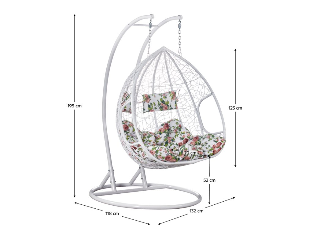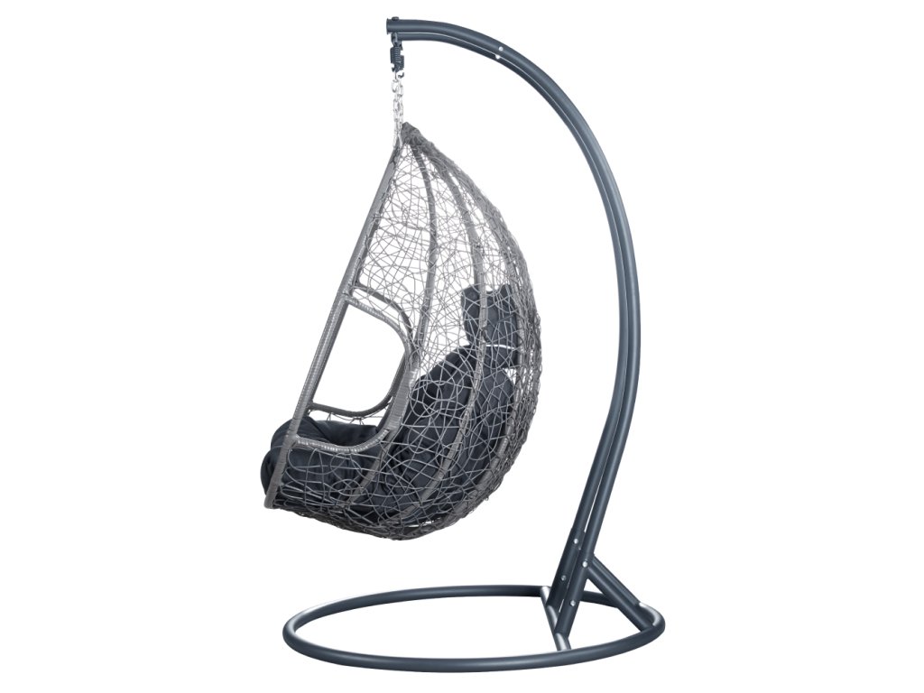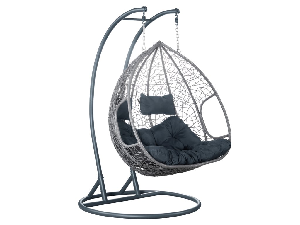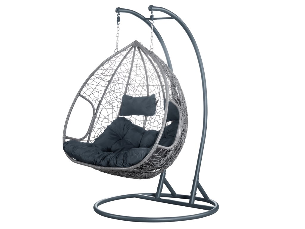Elegantní závěsné dvojkřeslo s ocelovou konstrukcí a technoratanu je ideální do exteriéru i interiéru. Součástí je měkký polštář a stojan.• Rozměry: 132×118×195 cm