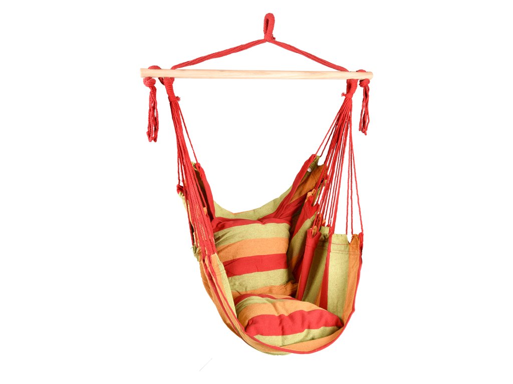 Závěsné křeslo, materiál 65 % bavlna, 35 % polyester, barevné provedení červená / zelená / žlutá, rozměr polštářů (š/h) 35 × 35 cm, rozpěrka z tvrdého masivního dřeva o průměru 3,2 cm a délce 90 cm, doporučená nosnost do 120 kg.Doplňkové parametry