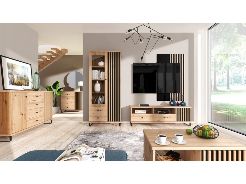 Obývací sestava s netradičním provedením detailu dvířek s lamelami. Barevné provedení je v kombinaci dub artisan/černá mat. Sestava se skládá z těchto položek (Š x V x H cm) -...