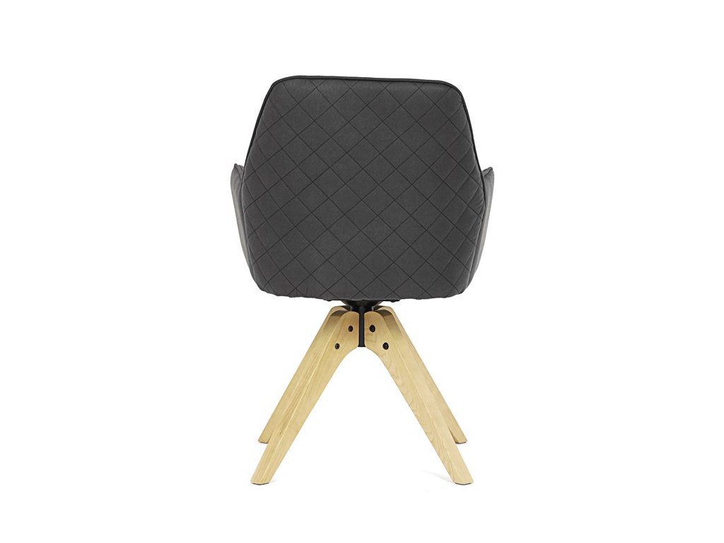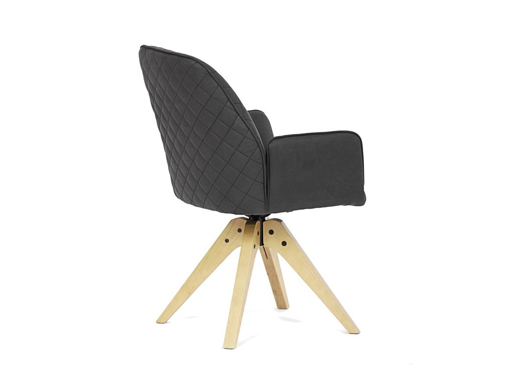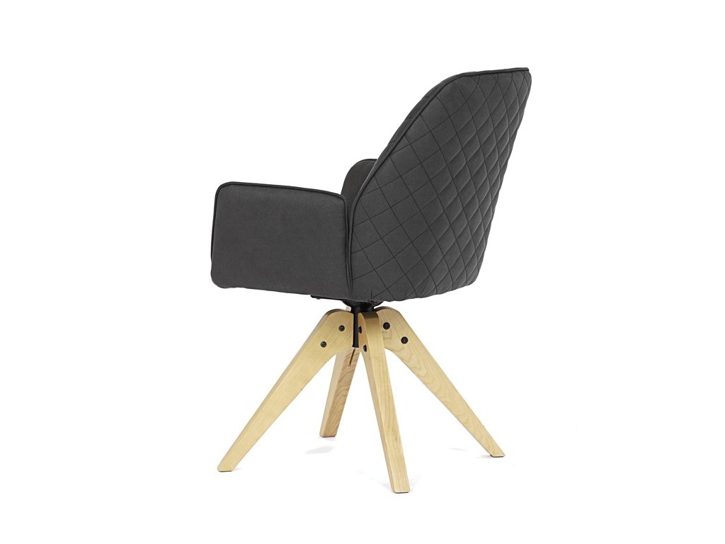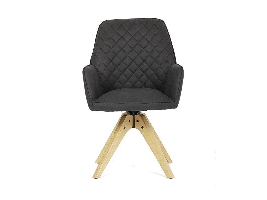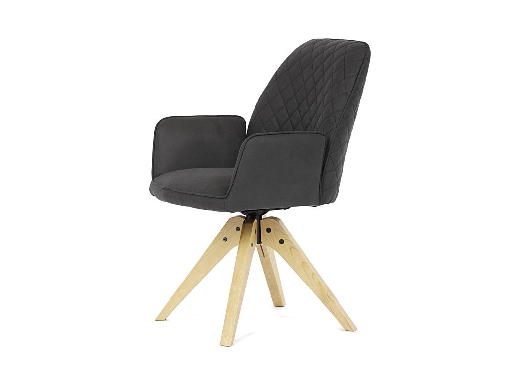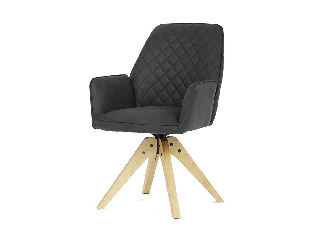 Jídelní židle s područkami potažená v textilii imitující broušenou kůži. Záda a opěrák jsou efektně prošity ve tvaru diamantu. Barva prošití je v barvě potahového materiálu. Nohy jsou z lakovaného jasanového dřeva, mořeny v odstínu dub. Sedák je otočný o 180° s tvarovou pamětí.Doplňkové parametry